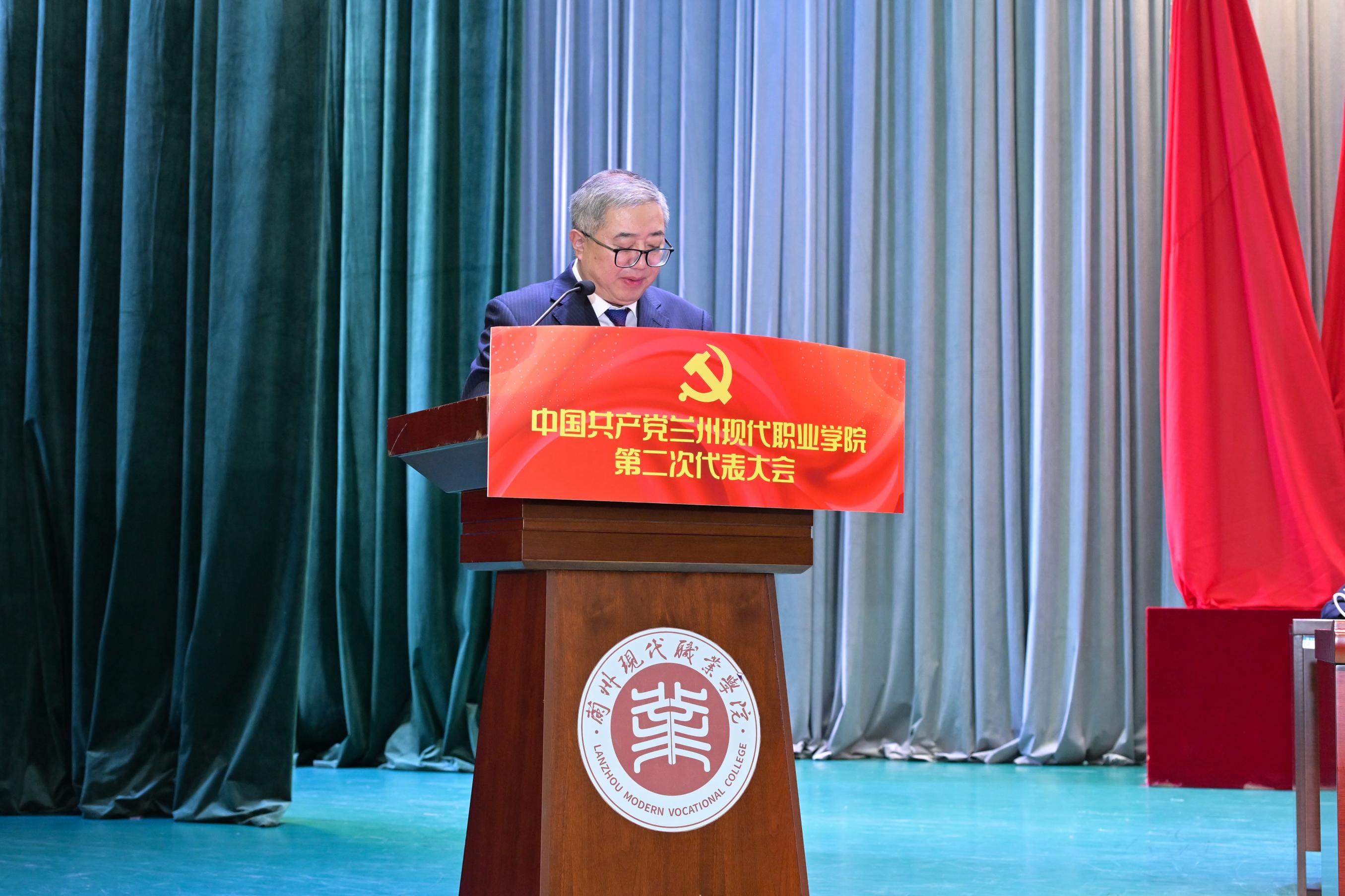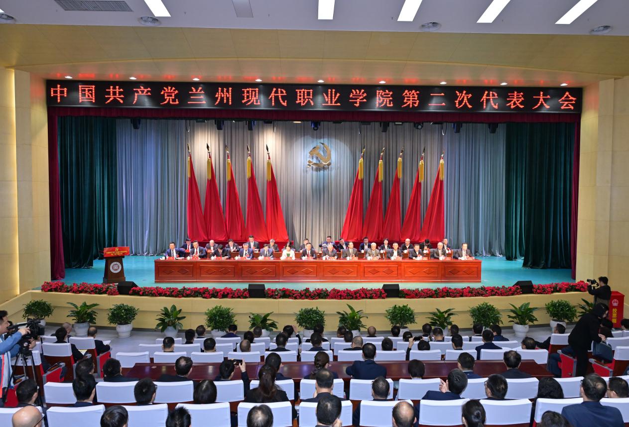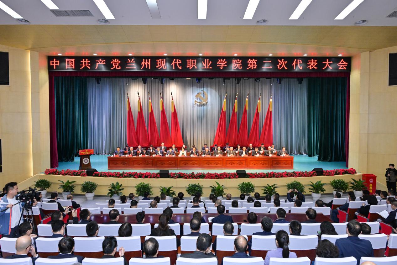 今天,兰州现代职业学院处处欣欣向荣,图书馆剧院内气氛热烈,庄严肃穆。主席台上方悬挂着“中国共产党兰州现代职业学院第二次代表大会”的会标,十面鲜艳的红旗分列两侧,正中簇拥着的党徽熠熠生辉。