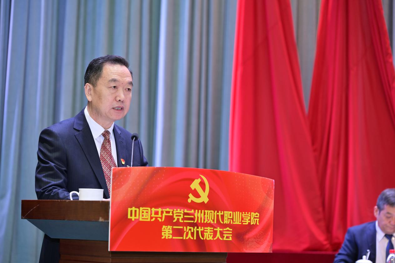 曾乐强代表中国共产党兰州现代职业学院第一届委员会,向大会作题为《守正创新 改革奋进 为建设现代化高水平综合职业院校努力奋斗》的工作报告。
