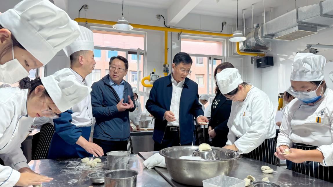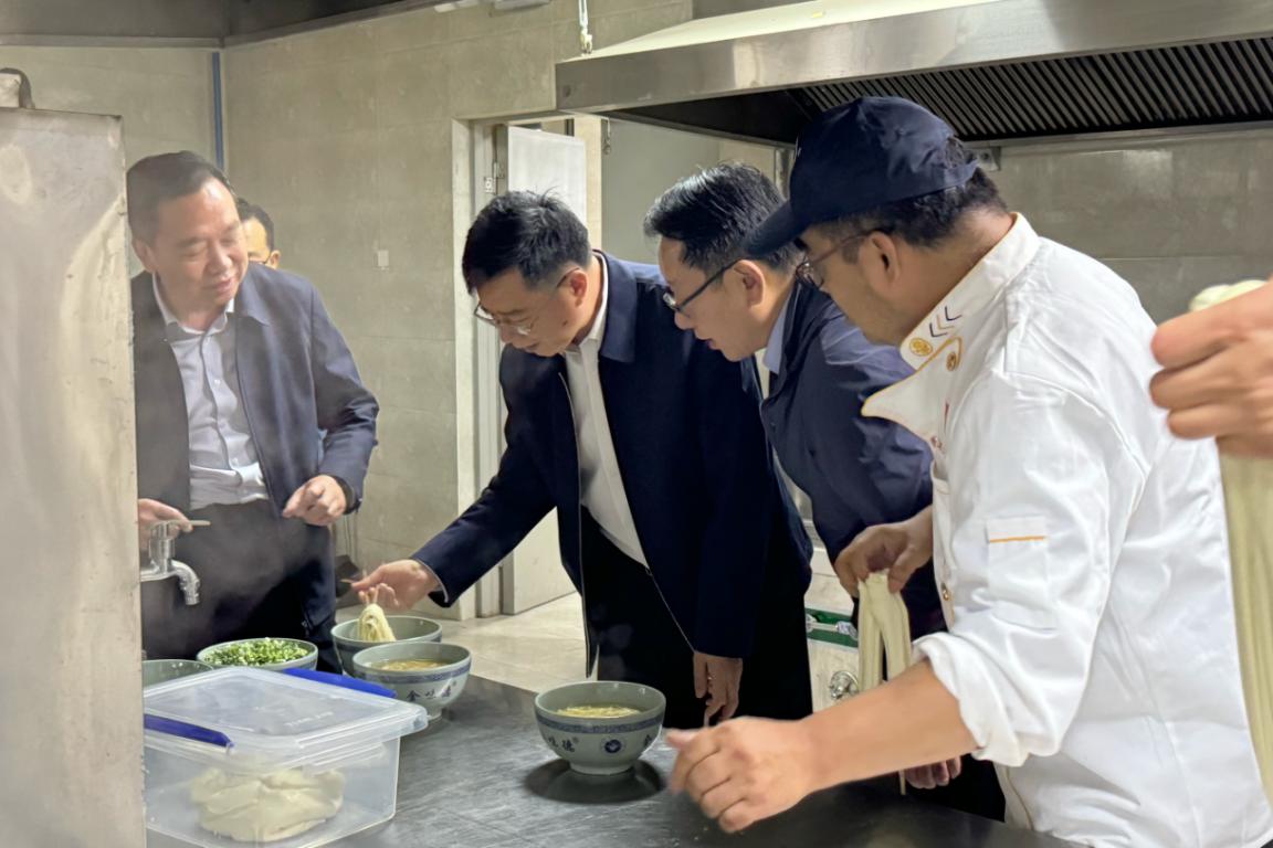 高永健一行参观考察了学院烹饪专业实训室、牛肉拉面产业学院、牛肉拉面实训基地、牛肉拉面大师工作室,与正在训练的老师、学生亲切交流,听取了学院即将举办的“中国兰州牛肉拉面产教融合共同体成立大会”的筹备情况。