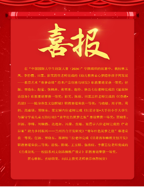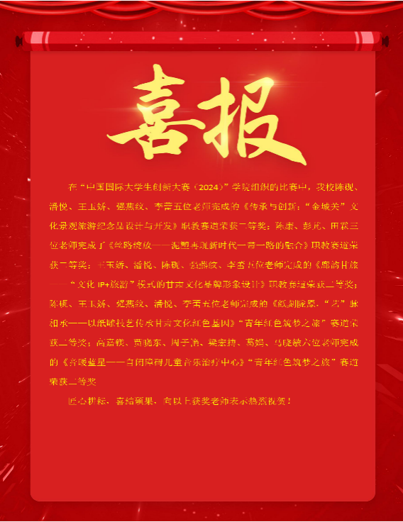 同时,强化学科竞赛实践,师生踊跃参与各类赛事屡获佳绩,在第十四届“挑战杯”甘肃省大学生创业计划竞赛和第十一届“学创杯”全国大学生创业综合模拟大赛甘肃省选拔赛中我院师生获得二三等奖;在甘肃省首届"道中华"铸牢中华民族共同体意识文创大赛中获得多项铜奖;在2024中国国际大学生创新大赛校赛中获得一二三等奖等多项荣誉,充分展示了学校的“双创”教育成果。通过广泛宣传与动员,2024年,我院在中国国际大学生创新大赛中报名项目数激增至153项,完成率100%,实现了参赛项目量的显著提升。