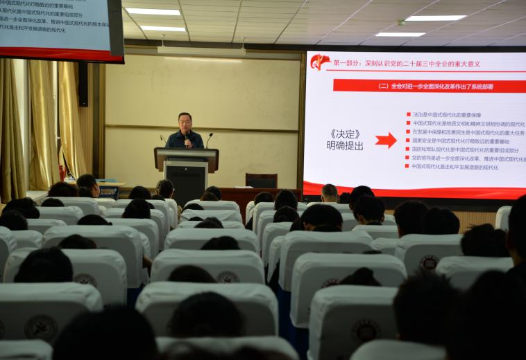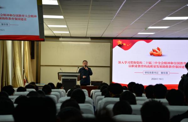 曾乐强书记从解读党的二十届三中全会精神出发,在充分讲授全会重大意义、推进全面深化改革总体要求及重点任务的基础上,强调了教育作为中国式现代化基础性、战略性的支撑地位,特别是职业教育在其中扮演的重要角色。他指出,当前职业教育正处于重要的发展机遇期,学院应当抓住机遇,深化产教融合,提升办学能力,致力于培养符合时代需求的技术技能型人才。