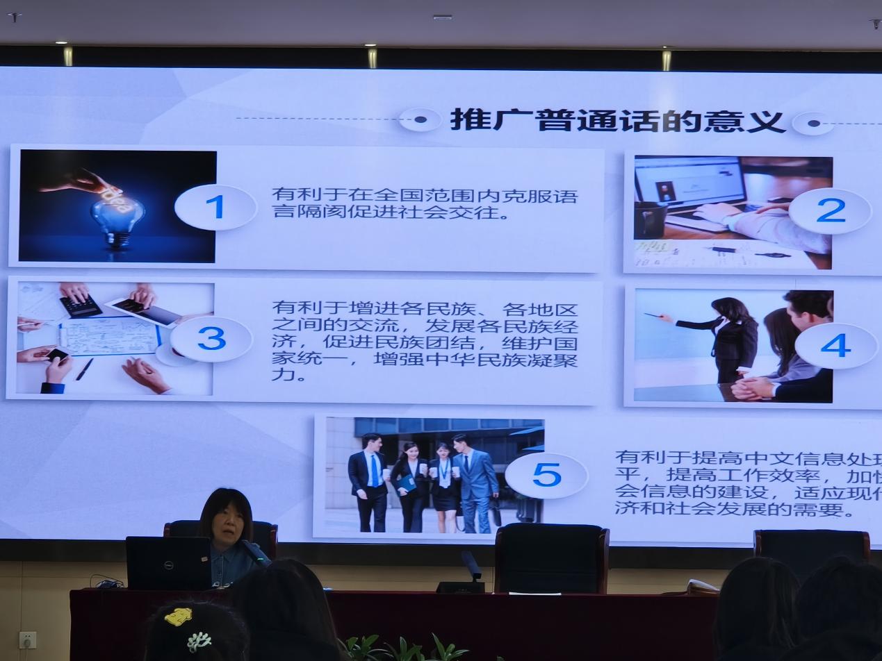 在培训活动中,学院校史馆副教授、甘肃省普通话水平测试员、甘肃省朗诵协会会员李巍老师为大家做了题为“加大推普力度,筑牢强国语言基石”专题讲座,从推广普通话的意义、普通话的由来、普通话基础知识、普通话水平测试和普通话学习等五方面进行了详细的讲解,并通过生动形象的PPT展示和现场示范发音,详细介绍了普通话的声母、韵母、声调等基础知识,并针对高职学生普遍存在的发音问题,如平翘舌不分、前后鼻音混淆等,进行了重点纠正。同学们认真聆听,积极模仿老师的发音,现场气氛热烈。