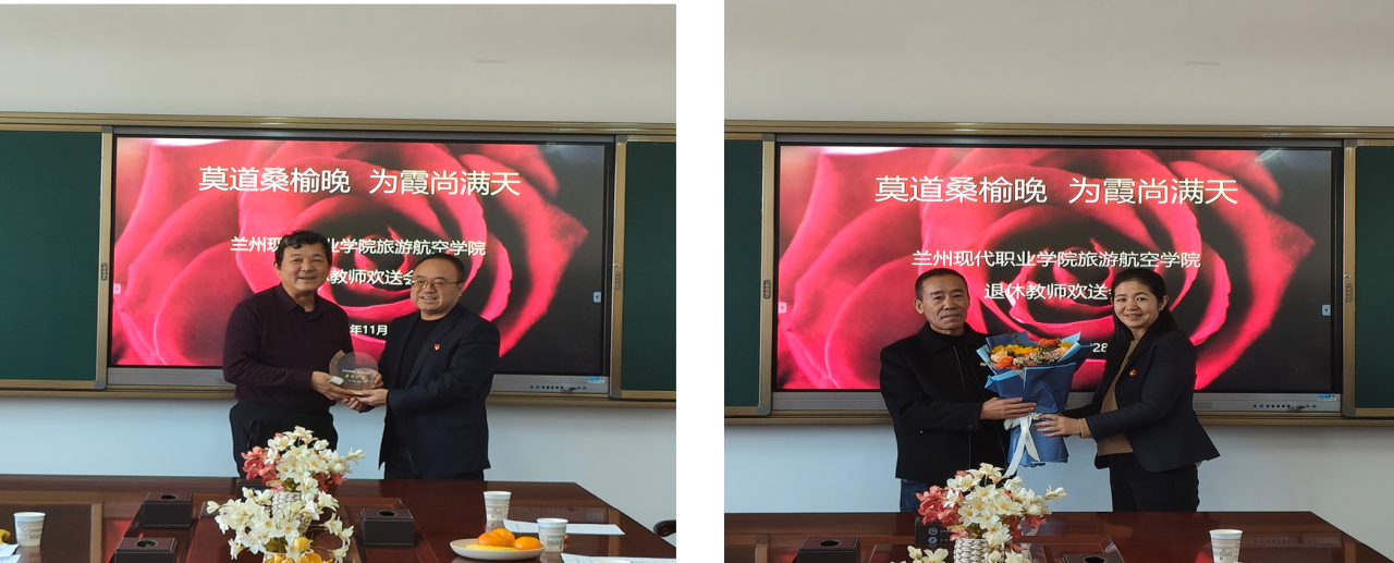 近日,旅游航空学院为2024年退休的吴元奇、陈晓东两位老师举行荣退座谈会。会上,旅游航空学院党总支书记刘京祥、院长郑西灵对两位教师为学校发展作出的贡献表示感谢,并希望他们继续关心学校发展。