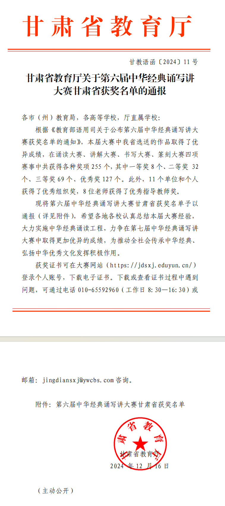 近日,中华经典诵写讲大赛组委会公布了第六届中华经典诵写讲大赛获奖名单。我院选送的作品取得了2项优异成绩,由周永花、龚蕊老师指导,杨淦富,马紫涵同学诵读的作品《土地的誓言》获得诵读大赛职业学校学生组全国三等奖;潘晓如老师指导,李玺同学书写的作品《兰亭集序》(硬笔)获得书写大赛大学生硬笔组全国三等奖。甘肃省教育厅特对本次获奖单位发文通报表扬。