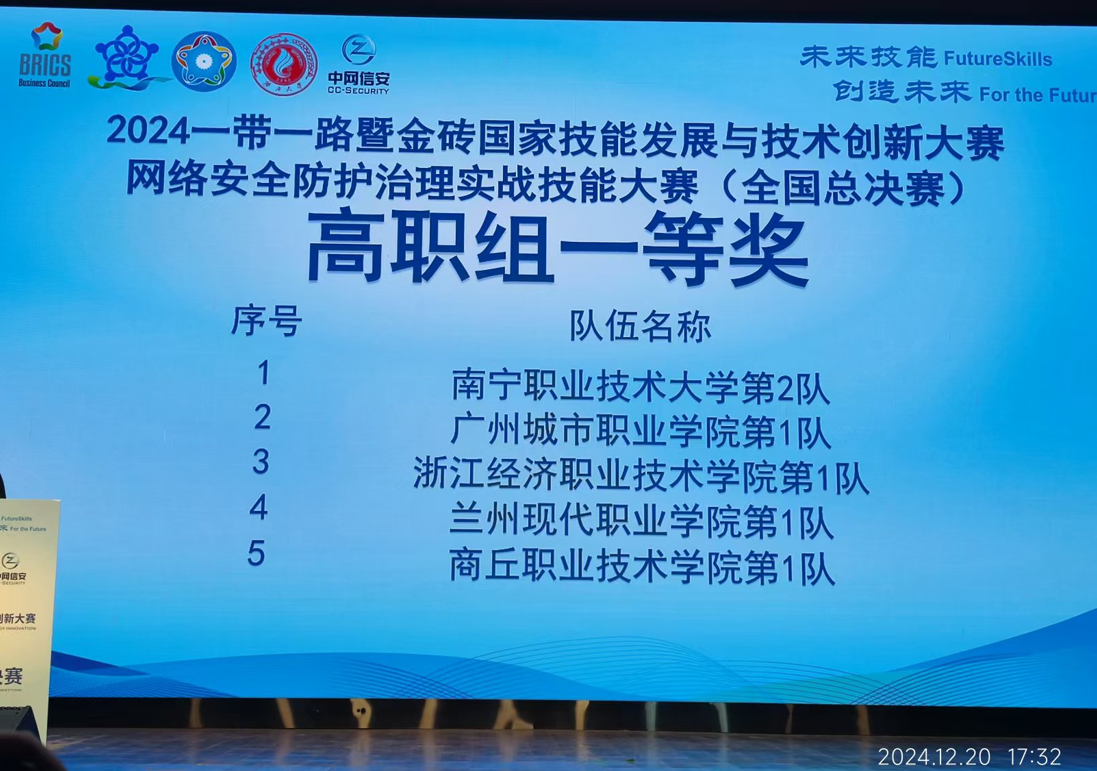 2024年12月19日至20日,2024一带一路暨金砖国家技能发展与技术创新大赛网络安全防护治理实战技能大赛(全国总决赛)在广西大学圆满举办。由理工学院安军、旅游航空学院李建基老师共同指导的兰州现代职业学院1队,喜获高职组一等奖的好成绩,实现了兰州现代职业学院在该项赛事上的新突破。
