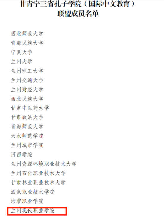 2024年12月24日,甘肃省国际中文教育研讨会暨“甘青宁三省孔子学院(国际中文教育)联盟”成立会议在西北师范大学隆重召开。兰州现代职业学院作为市属高职院校唯一代表参会,并正式加入“甘青宁三省孔子学院(国际中文教育)联盟”,学院副院长鲁小勇、交流合作处工作人员参加会议。