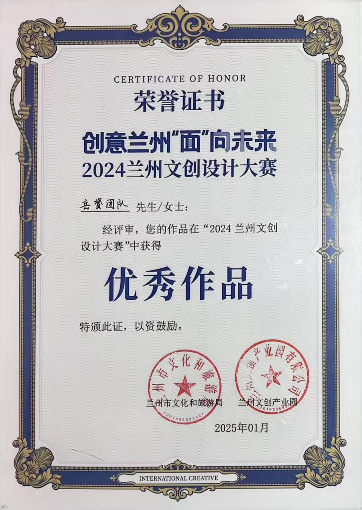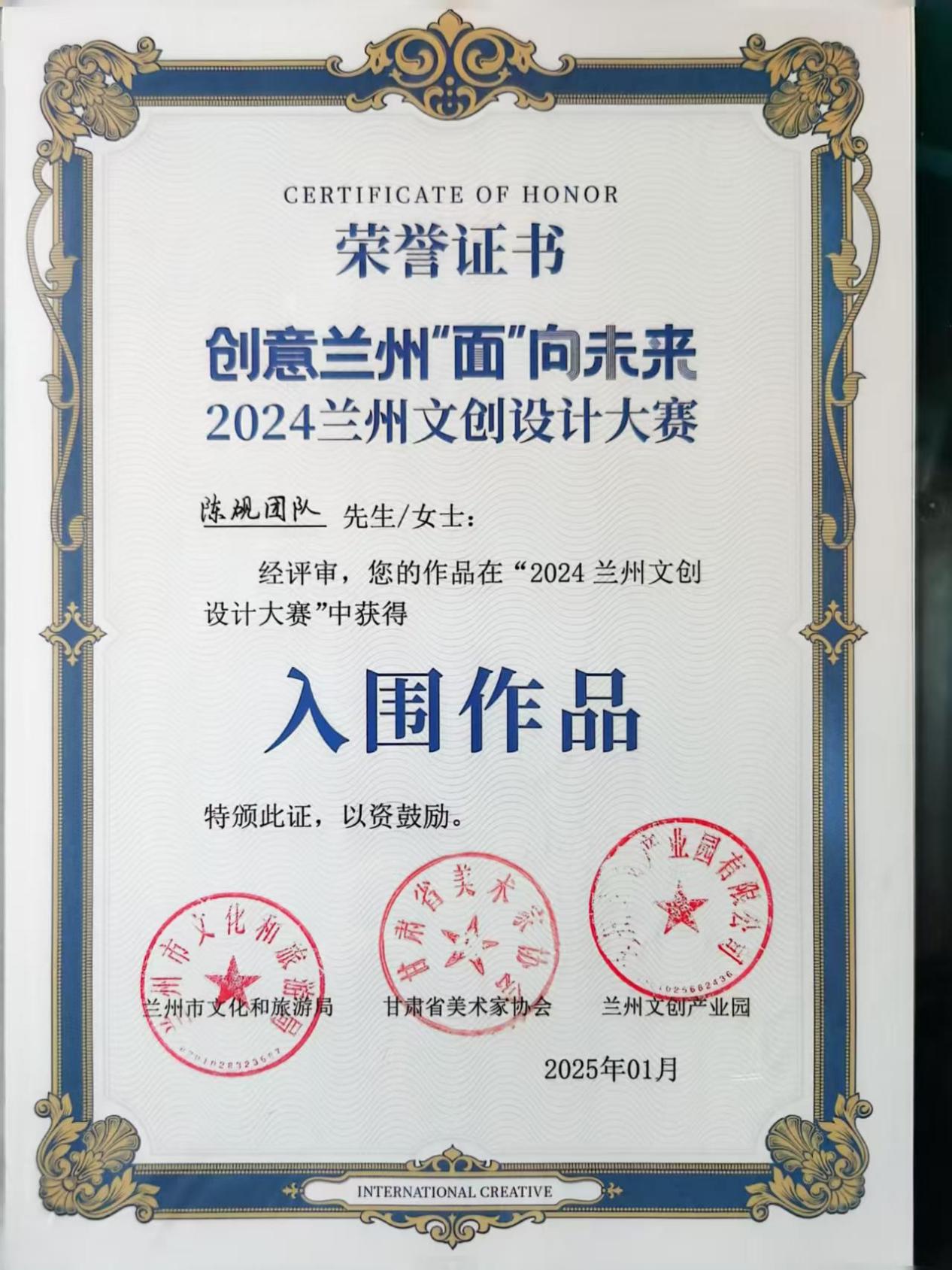 2025年1月16日,由兰州市文化和旅游局、甘肃省美术家协会指导,兰州文创产业园主办的创意兰州“面”向未来——2024兰州文创设计大赛暨兰州牛肉拉面文创作品征集活动在兰州文创产业园A9国际艺术交流中心圆满落幕。我院教师岳赟和陈砚团队的2项作品从437组参赛作品中,凭借创意独特、设计精湛的作品荣获优秀奖,为学院争得了荣誉。