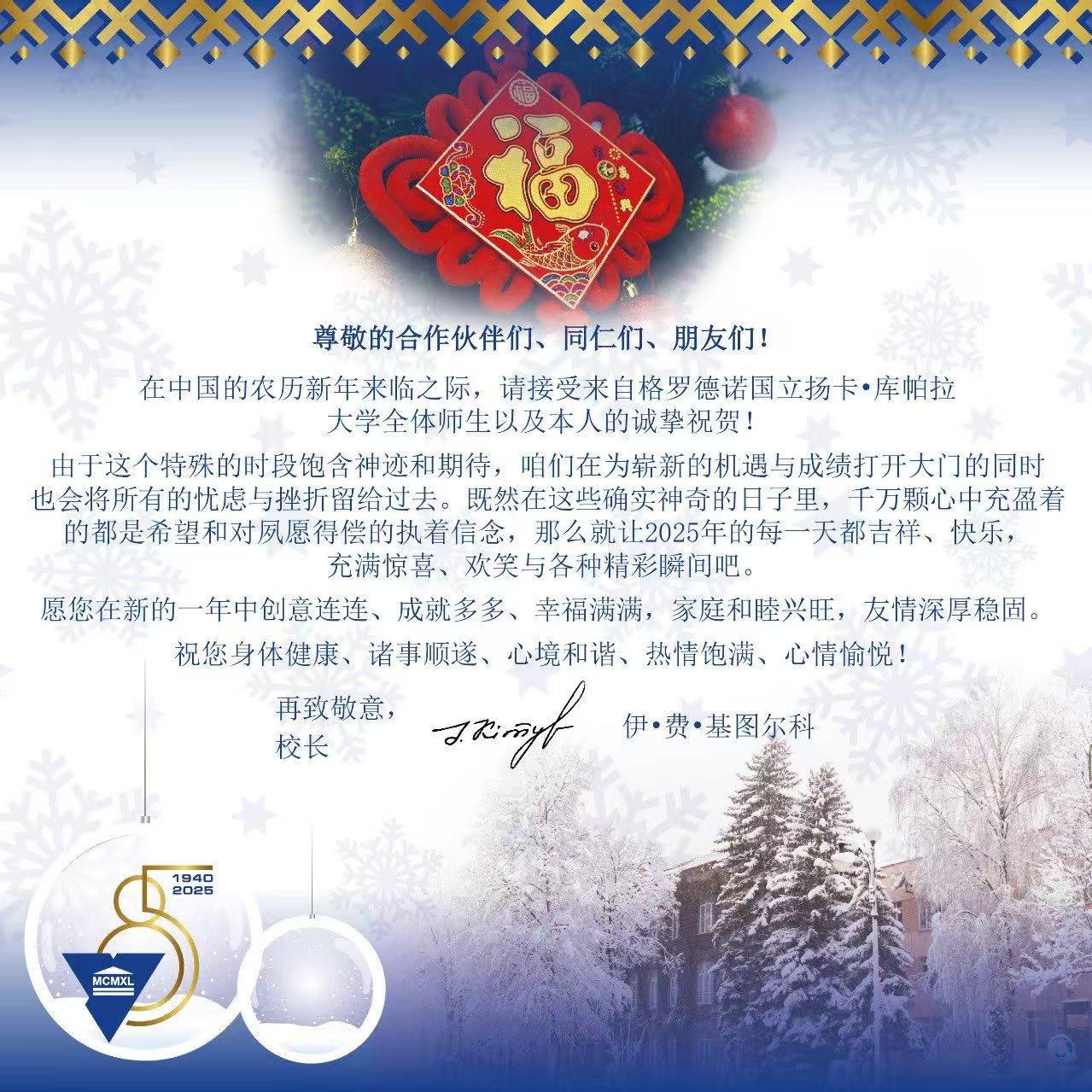 近日,我院收到来自白俄罗斯格罗德诺国立扬卡·库帕拉大学的新春贺信。校长伊·费·基图尔科代表白俄罗斯格罗德诺国立扬卡·库帕拉大学全体师生,向我院全体师生致以亲切的节日问候和美好的春节祝福。新春贺词传递了深厚的友谊与美好的祝愿,不仅是对过去一年双方合作成果的肯定,更是对未来合作前景的美好期许。