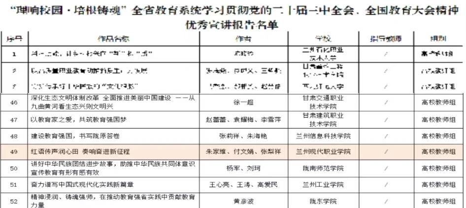 近日,兰州现代职业学院理工学院教师第二党支部选送的《红语传声润心田,奏响奋进新征程》宣讲作品,在全省教育系统学习贯彻党的二十届三中全会、全国教育大会精神优秀宣讲作品评比中脱颖而出,顺利入选全省优秀宣讲报告行列。
