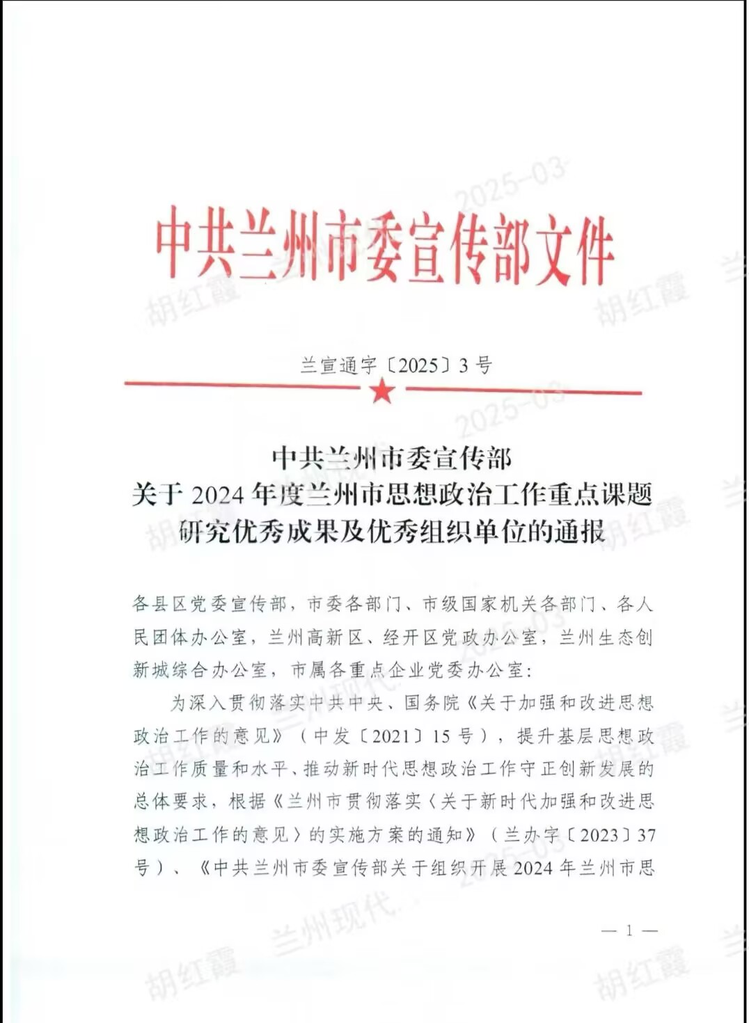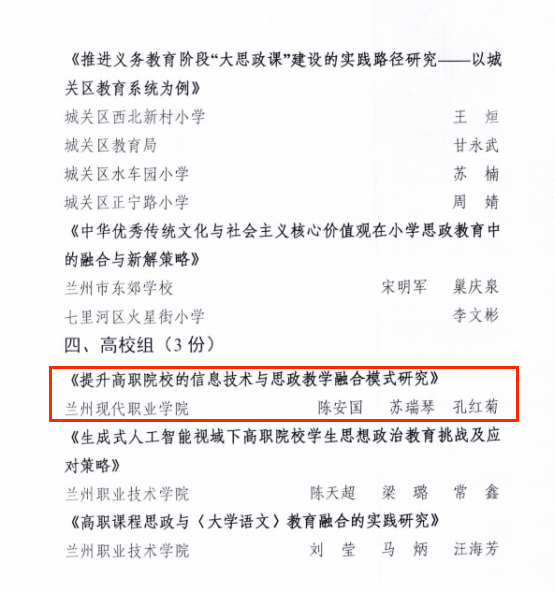 为深入贯彻中共中央、国务院《关于加强和改进思想政治工作的意见》提升基层思想政治工作质量和水平,推动新时代思想政治工作守正创新发展的总体要求,中共兰州市委宣传部组织开展2024年兰州市思想政治工作重点课题研究级优秀成果评选工作。近日,中共兰州市委宣传部公布了2024年兰州市思想政治工作重点课题研究优秀成果获奖名单,我院陈安国、苏瑞琴、孔红菊三位教师共同研究的课题《提升高职院校的信息技术与思政教学融合模式研究》荣获二等奖,充分展示了我院教师在思想政治工作领域的专业素养和创新精神。