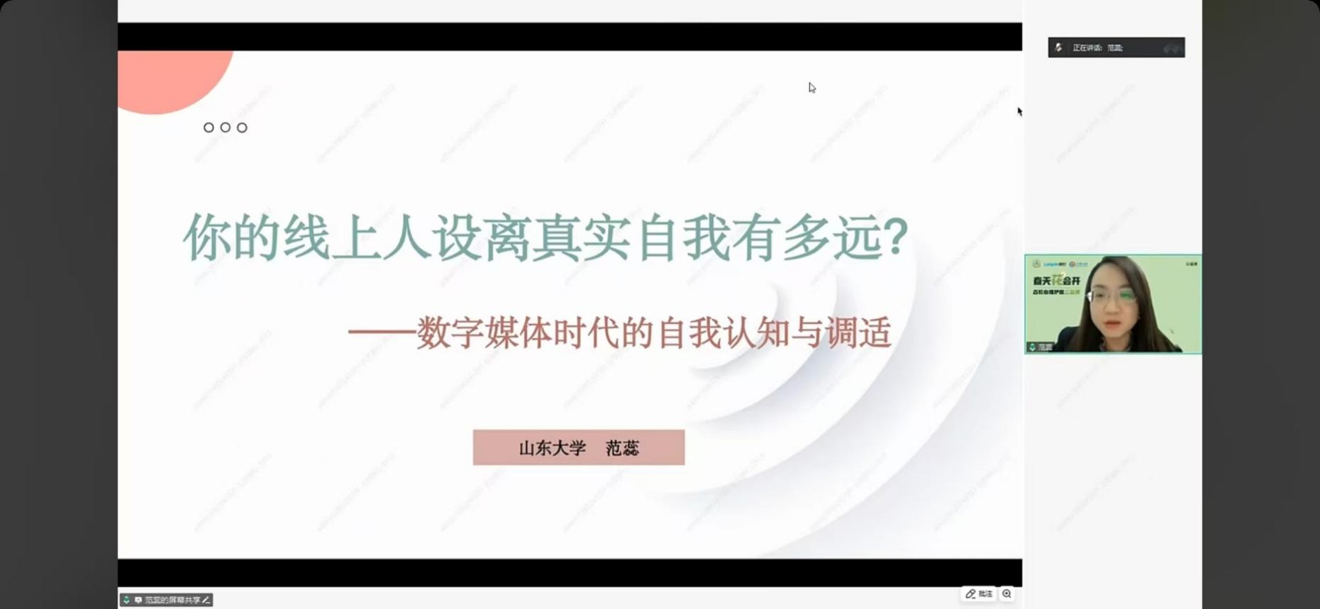 3月7日的课程《你的线上人设离真实自我有多远?——数字媒体时代的自我认知与调适》由山东大学范蕊老师主讲。范老师围绕你在扮演谁、你到底是谁、在虚拟与现实之间找到平衡三个方面,从?数字媒体时代的自我认知、?自我认知与调适、?心理健康的重要性等方面和同学们进行了详细的探讨。本次课程氛围轻松、贴近学生,特别是对线上人设与真实自我反差极大弊病的剖析,引发了同学们如何平衡双面人生的思考,有利于促进我们更好的适应数字媒体时代的生活,护航自我成长与心理健康。