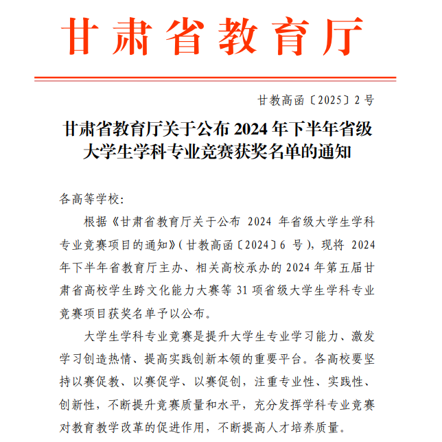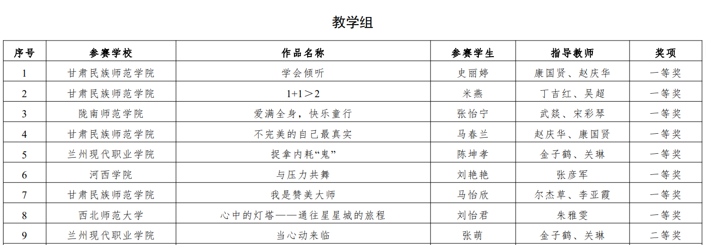 根据《甘肃省教育厅关于公布2024年省级大学生学科专业竞赛项目的通知》精神,为进一步做好心理学知识普及,引导学生积极参与专业实践,提高综合素质,在由甘肃省教育厅主办,西北师范大学承办的第四届甘肃省大学生“健心杯”心理健康教育综合技能大赛中,我院学生喜获一等奖1项、二等奖1项、三等奖1项,金子鹤、关琳2位老师荣获优秀指导教师。