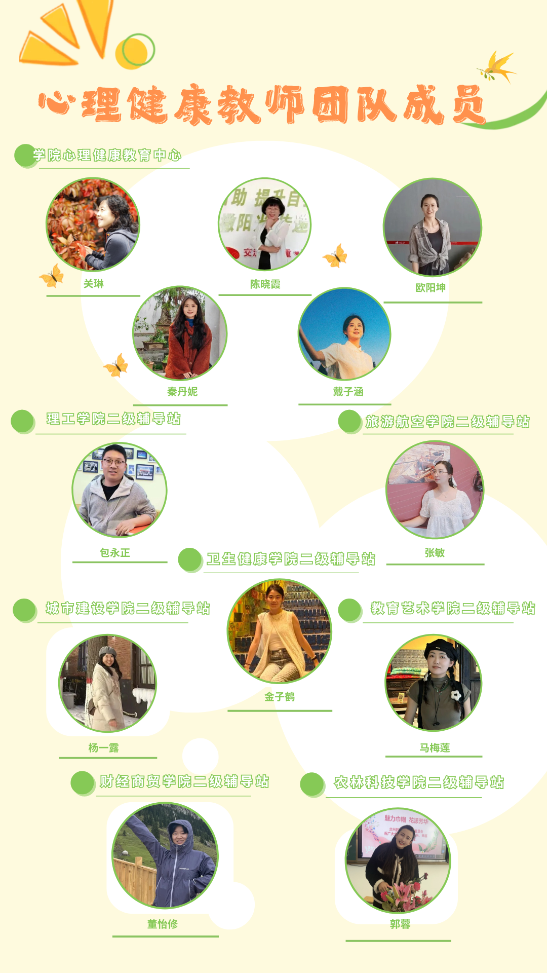 中心现有专职教师5人,二级心理辅导站专职干事7人。心理健康教育教师团队13人中,硕士10人、本科3人,国家二级心理咨询师1人、三级心理咨询师8人、中科院咨询师1人、国家心理咨询培训师1人,教授1人、副教授1人、讲师3人、助教3人、甘肃省心理健康服务专家库专家2人。教师团队工作热情饱满,咨询经验丰富,理念积极健康,愿以不断成长的心态护航学生全面发展。
