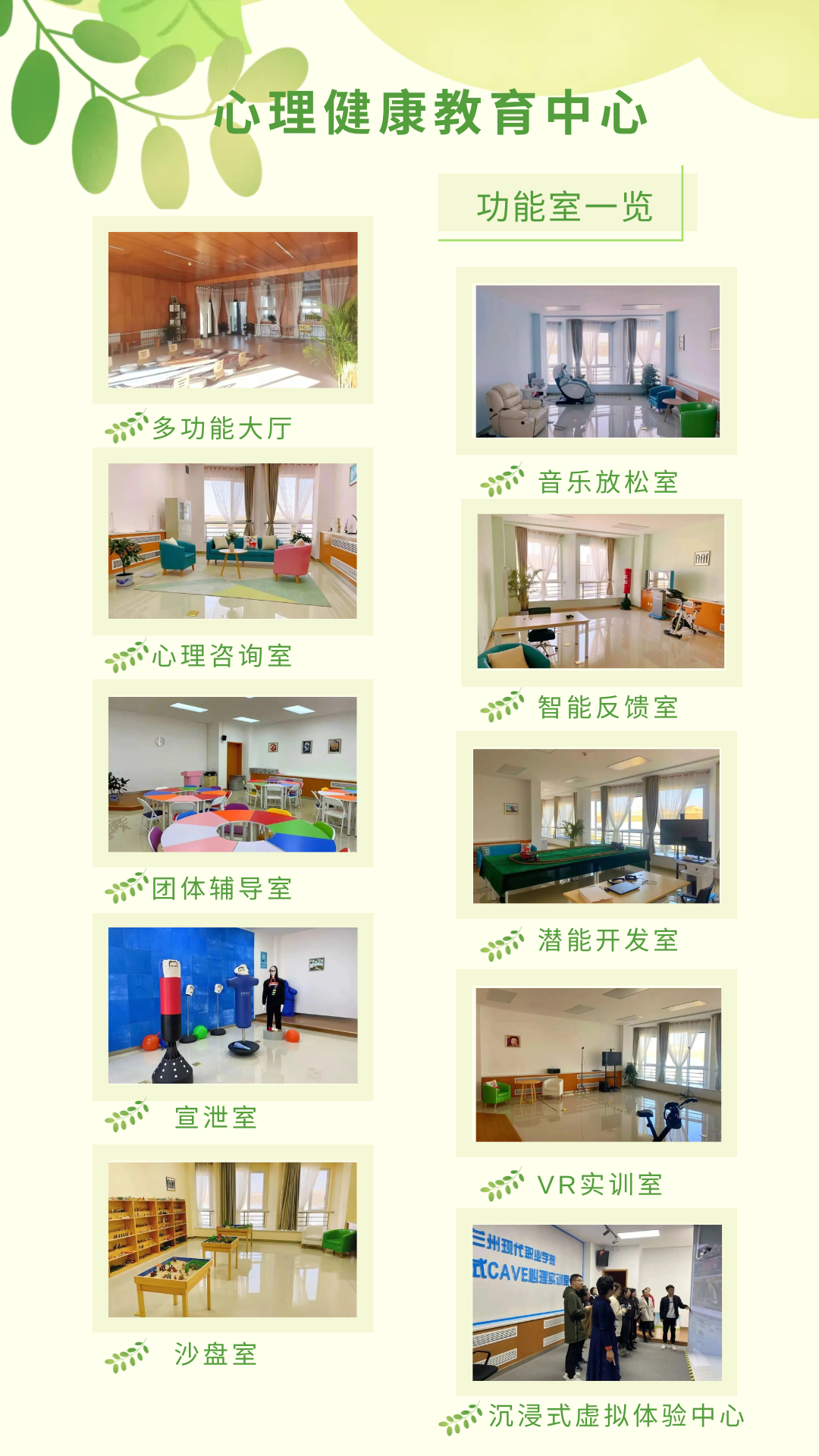 中心占地1700平方米,投资约200万元,设有心理咨询室、宣泄室、团体辅导室、沙盘室、音乐放松室、智能反馈室、潜能开发室、VR实训室、沉浸式虚拟体验中心等15间功能室,设施齐全,功能完备,环境温馨,能为来访者提供安全、自由、温馨的环境和智能、准确的心理反馈,提升情绪和压力管理水平,促进身心平衡。