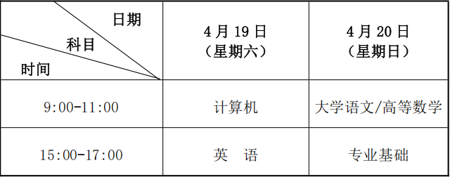 (四)考试时间。全省统一考试时间为 2025 年 4 月 19 日、20 日。具体考试时间与考试科目安排如下(北京时间):