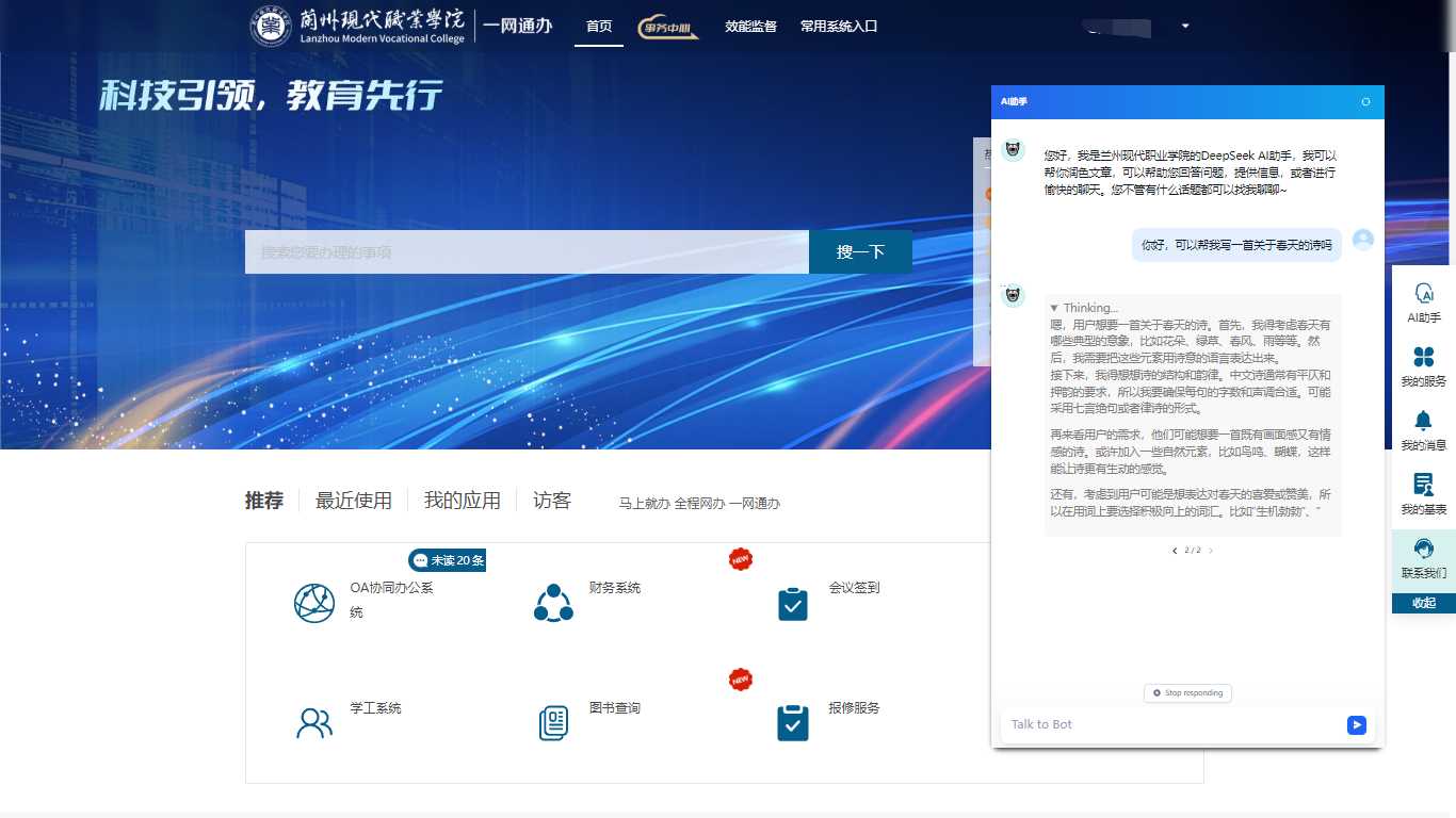 本地化部署DeepSeek AI大模型,在一网通办平台开通智能服务专区。