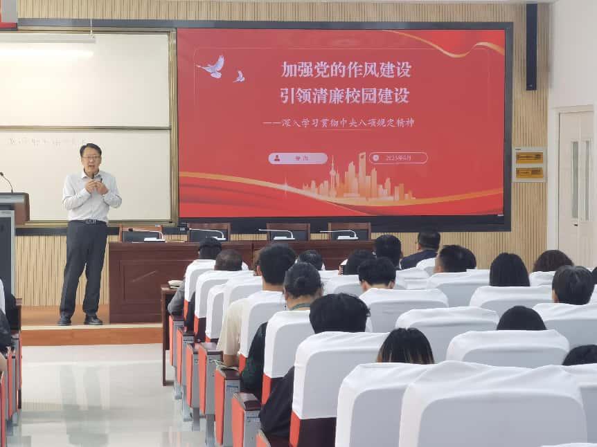 6 月 6 日,财经商贸学院党总支书记姜旗以“加强党的作风建设 引领清廉校园建设” 为题讲党课,回溯百年作风建设历程,解读八项规定内涵,结合教育行业分析党风与师德关联,列举反面案例警示。同时,提出三项举措推进清廉校园建设,财经商贸学院党员纷纷表示将以实际行动注入 “廉动力”。