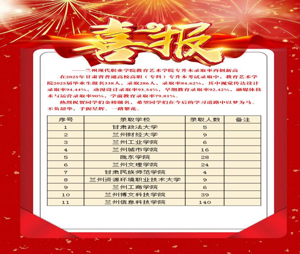 2025 年甘肃省专升本考试中,院教育艺术学院 338 人参考,286 人录取,整体录取率 84.62%。视觉传达设计、动漫设计、早期教育、融媒体技术与运营等专业录取率超90%。成绩彰显学院育人成效。