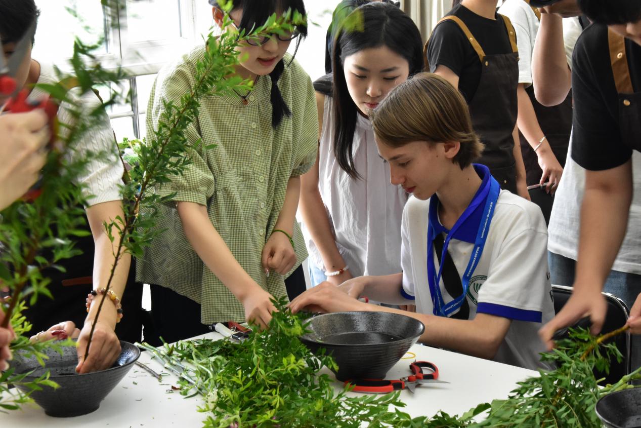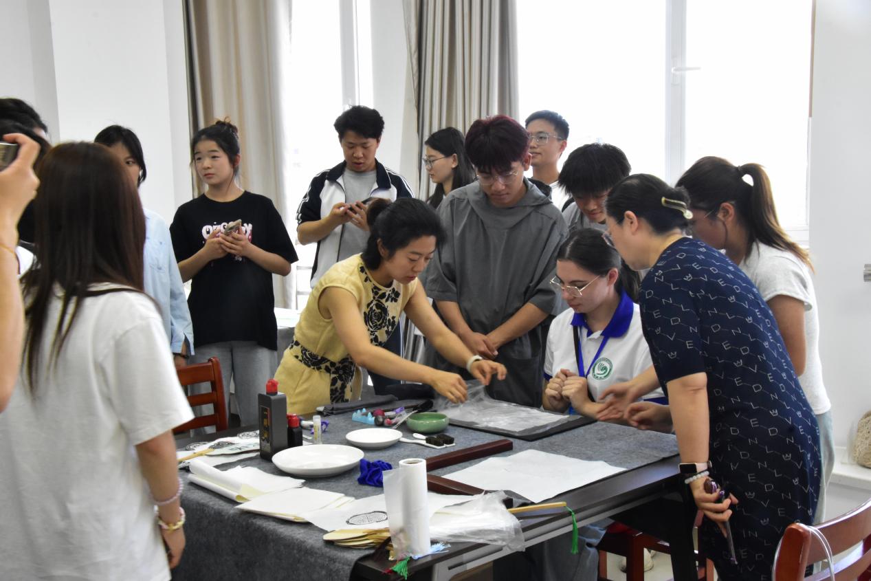 在大学生创新创业中心,营员们深度体验了产教融合实践项目。在现代农业双创工作室观摩园林微景观设计,品鉴文冠果茶艺,动手完成东方插花作品;在传拓技艺工作室实践古法拓印技艺和刻板画团扇制作;在视觉艺术工作室尝试掐丝珐琅头簪及火漆印章创作;在艺韵匠心工作室体验剪纸技法与彩塑非遗工艺;在杏林工作室辨识中药材并感受中医特色疗法。