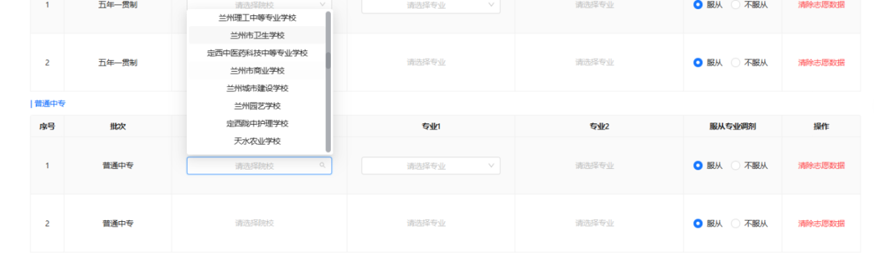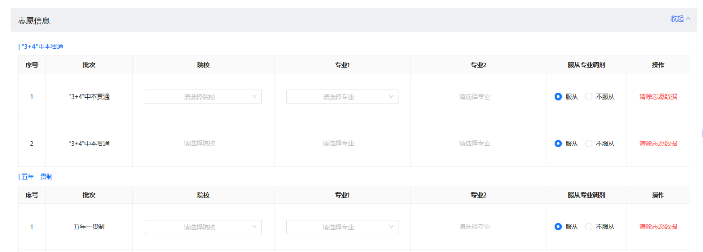 4.填报志愿:考生中专志愿共分为三个类别,分别为"3+4中职与本科贯通培养”、“五年一贯制”、“普通中专,即对应我校的“3+2”贯通培养模式”。