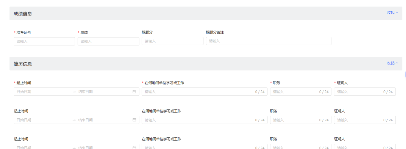 2.成绩信息和简历信息:学生个人小学、初中详细学习经历。应届毕业生请准确填写准考证号及中考成绩。