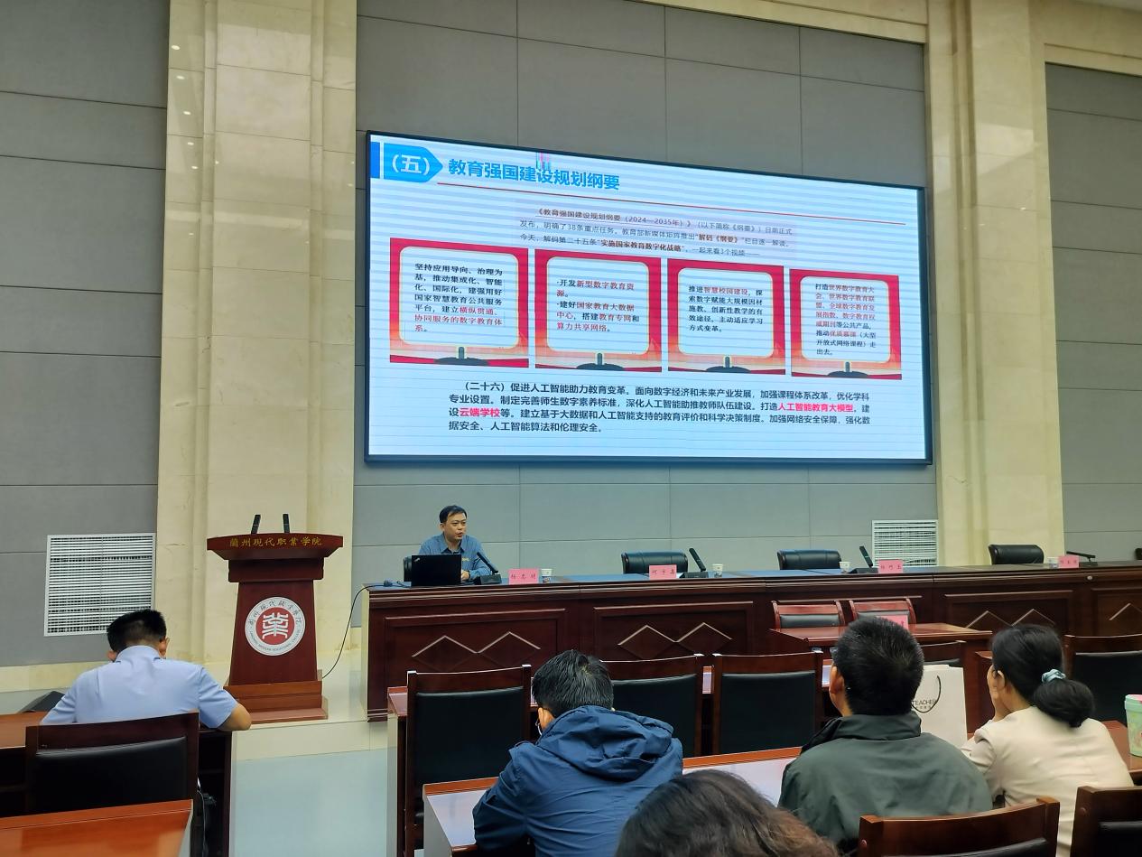 随后,杨忠明教授以《专业垂类大模型 —— 赋能职业教育教学改革路径的探索与实践》为题作专题报告。他紧扣教育数字化转型趋势,从发展机遇、场景重构、实践案例、行动建议四个维度,分享广东科学技术职业学院在 AI通识课程建设、专业垂类大模型开发等方面的经验,为学院构建 “职教大模型教育教学应用矩阵” 提供可落地方案。