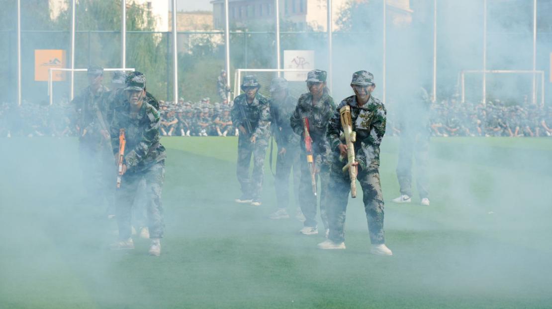 大会在国歌声中启幕,新生以整齐队列、刚劲战术演练展现青春风貌。