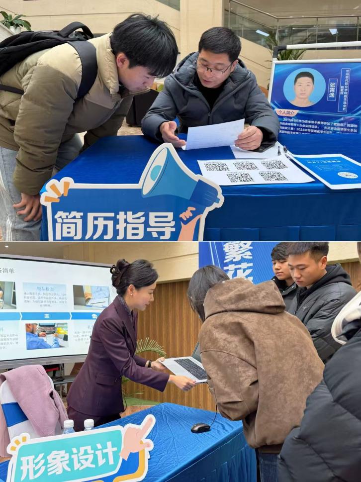 活动现场设置政策宣传咨询、就业指导、技能展示与体验等服务。学院就业指导教师礼仪教师受邀,在活动现场求职者提供简历诊断与优化设计面试礼仪与职业形象塑造建议