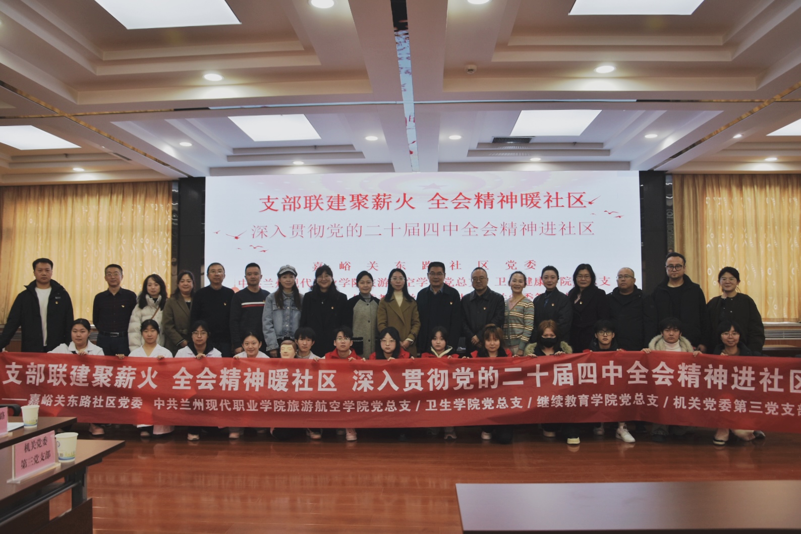 1121日,兰州现代职业学院旅游航空学院党总支联合嘉峪关东路社区党委、卫生健康学院党总支、继续教育学院党总支及学院机关党委第三党支部,共同举办“支部联建聚薪火 全会精神暖社区”党建共建活动,推动党的二十届四中全会精神深入基层、服务民生。